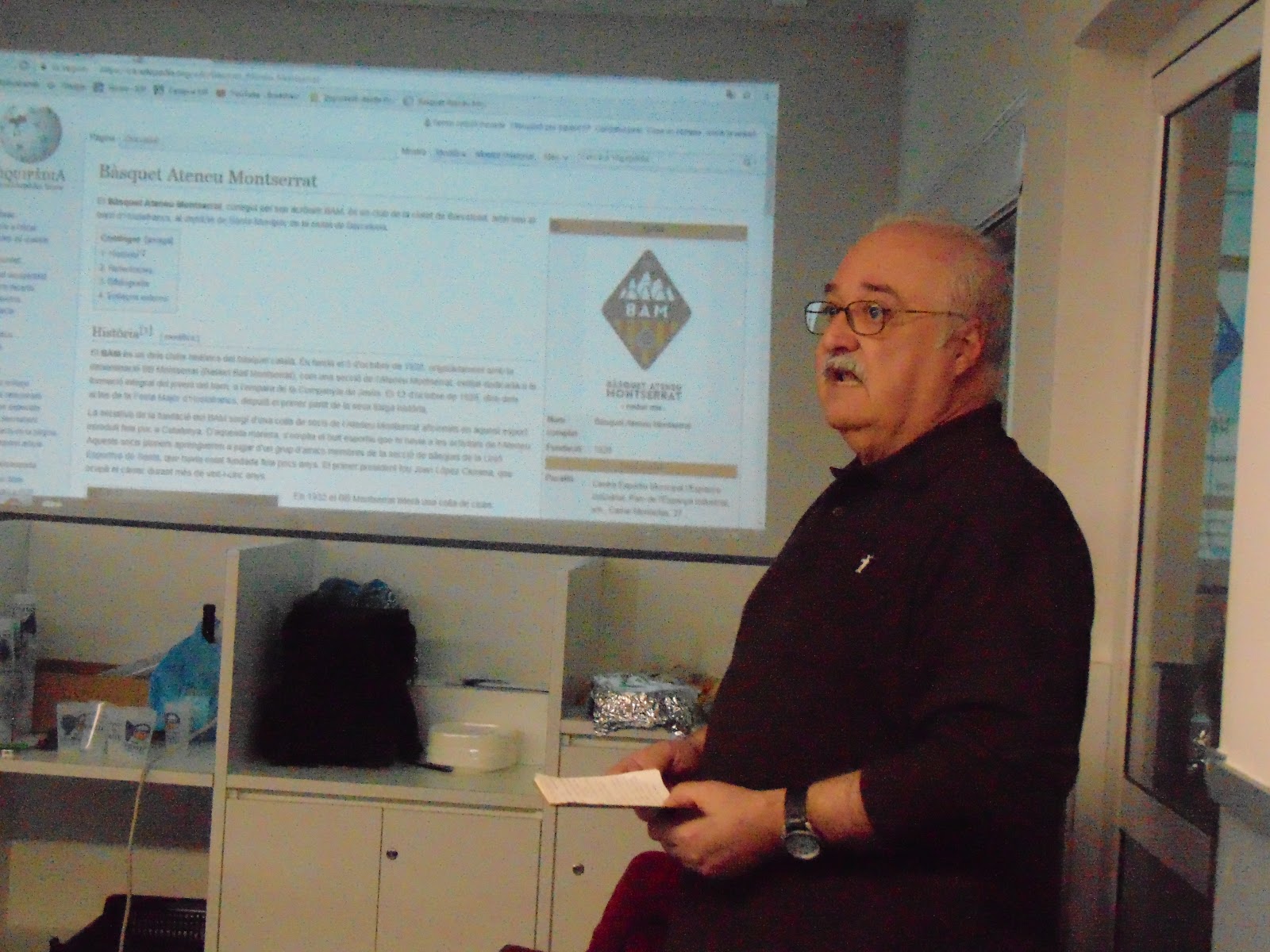 Enric Bertran explicà els continguts de l’article Bàsquet Ateneu Montserrat penjat a l’enciclopèdia lliure viquipèdia, i elaborat de conjunt amb Fèlix Galbete. Va presentar el text com un resum divulgatiu de la història de l’entitat, però amb dades rigorosament contrastades, que tenia per mira preservar-ne la memòria, i va posar de relleu el seu caire inacabat, en el sentit que romania obert a les aportacions de tothom que hi trobés mancances o errors.